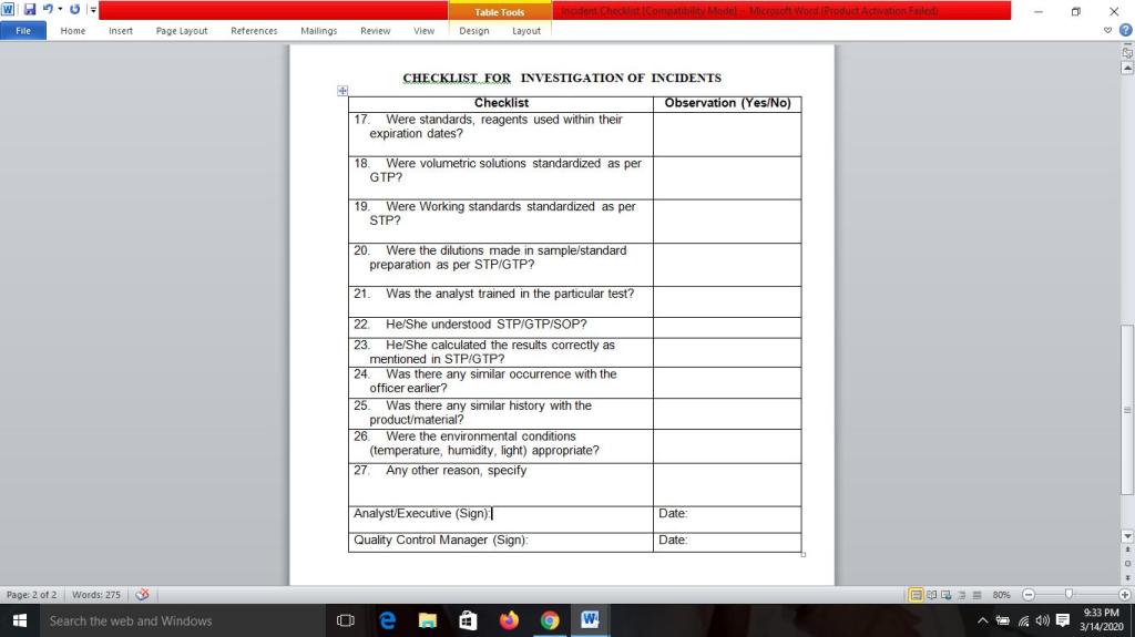 The checklist will be completed by the QC Head/Designee and analyst together. The QC Head/Designee will interview the analyst, and will check relevant documents, in order to answer questions which will help identify whether common or obvious laboratory errors were the root cause of the Incident/atypical result.