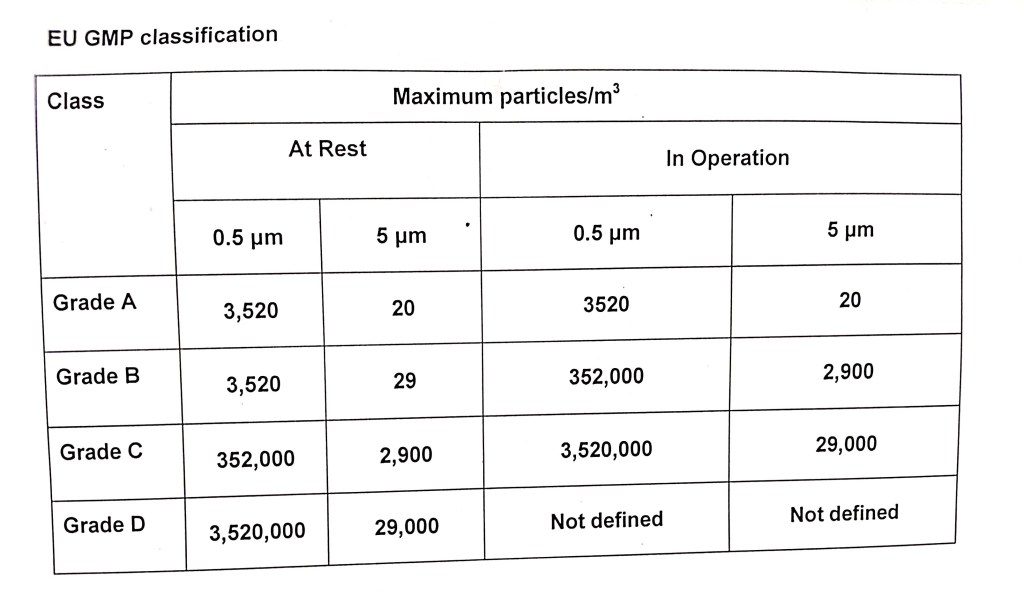 EU GMP guidelines are more stringent than others, requiring clean rooms to meet particle counts at operation (during manufacturing process) and at rest (when manufacturing process is not carried out, but room AHU is on).