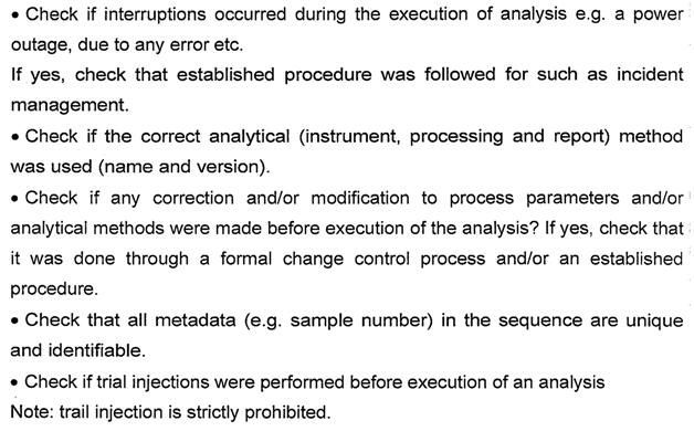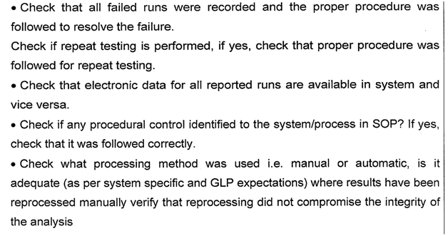 For example, the audit trail for a high performance liquid chromatography (HPLC) run should include the user name, date/time of the run, the integration parameters used, and details of a reprocessing, if any.